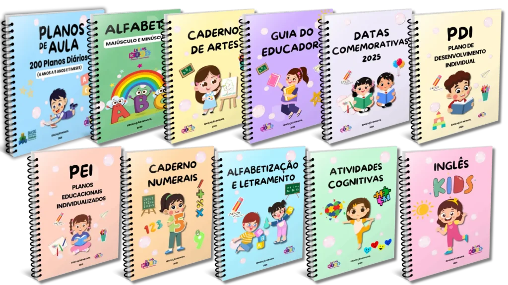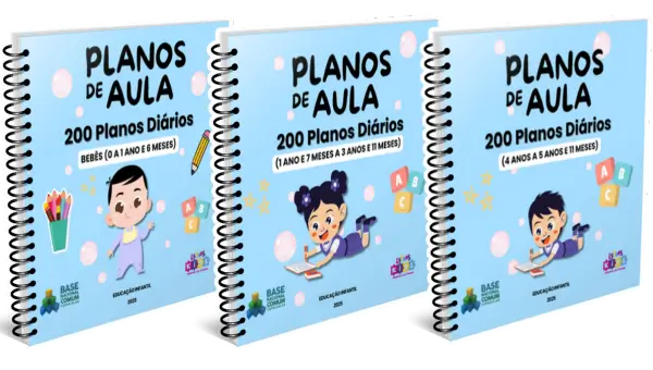 São 200 planos de aula por faixa etária, além do alfabeto, PDI, PEIs, datas comemorativas, guia do educador e caderno de artes.